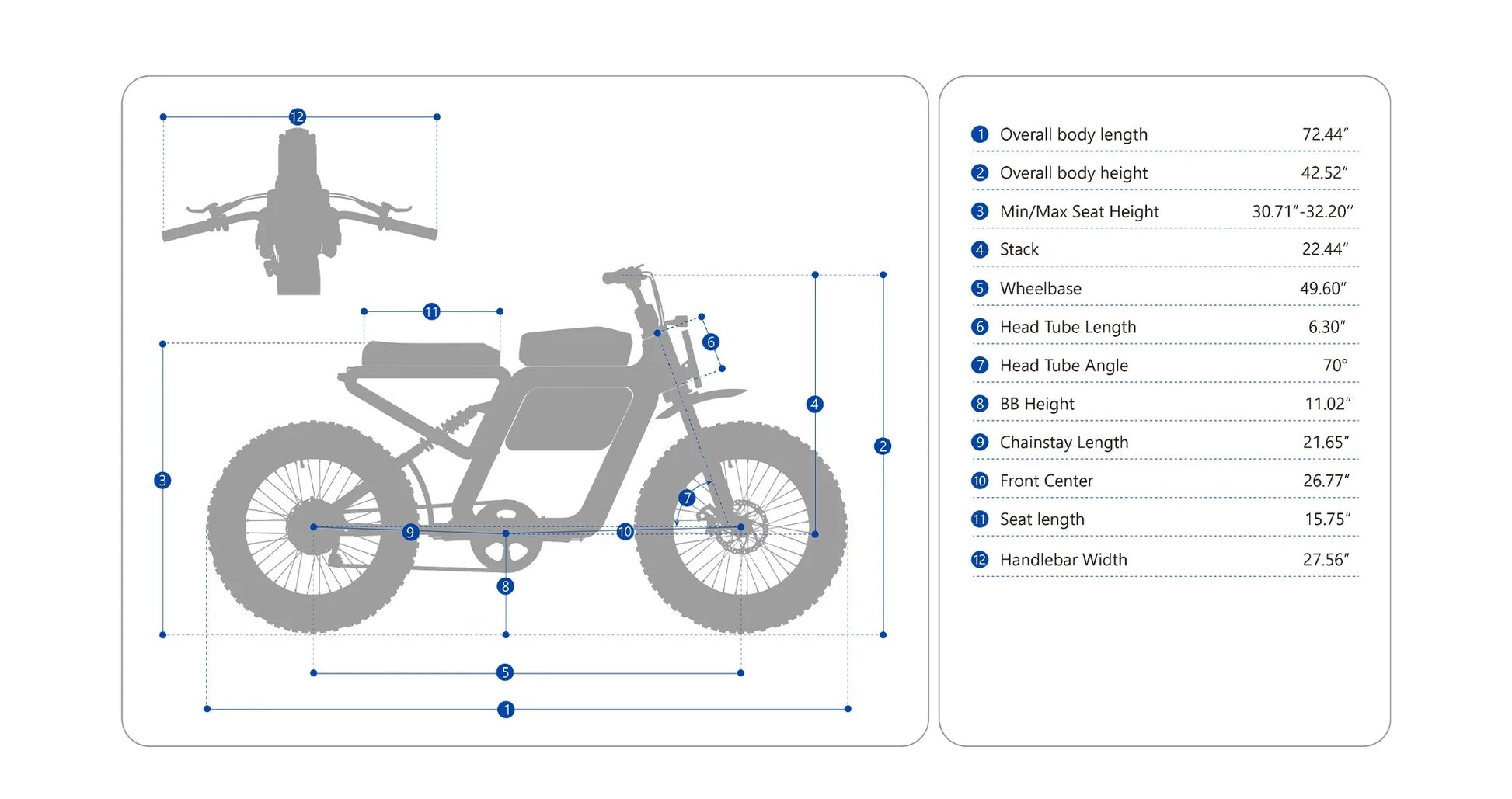 - Front suspension: motorcycle-grade inverted front forks providing 60mm travel